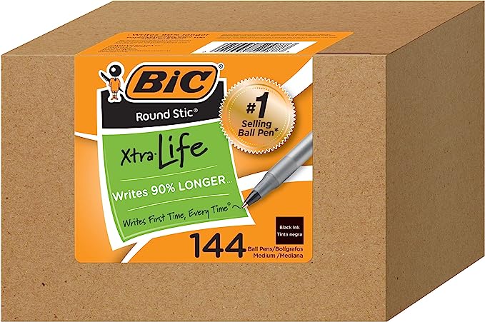BIC Round Stic Xtra Life Ballpoint Ink Pens, Medium Point (1.0mm), Black Pens, Flexible Round Barrel For Writing Comfort, 144-Count